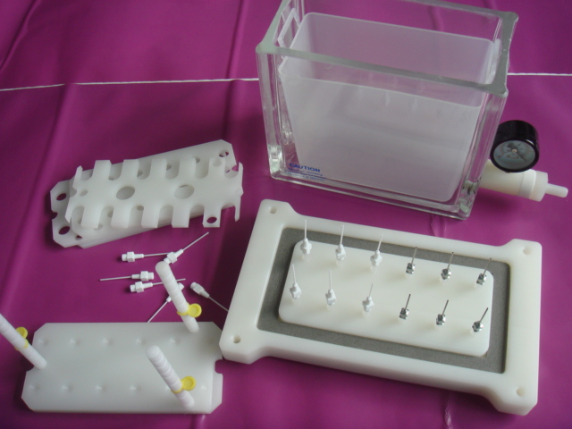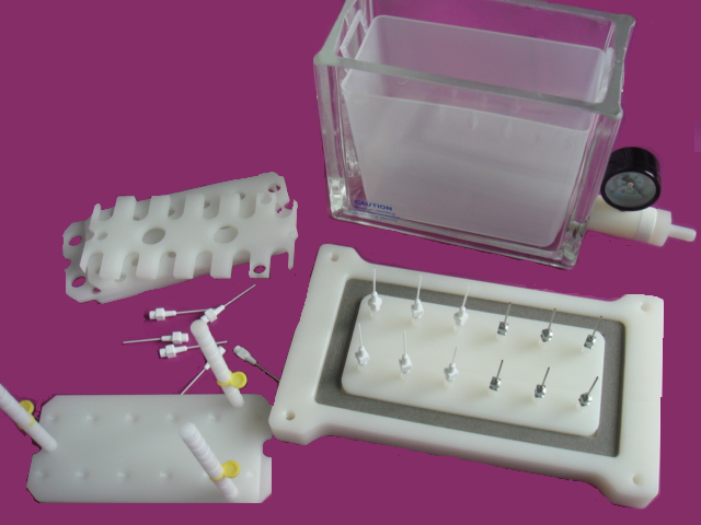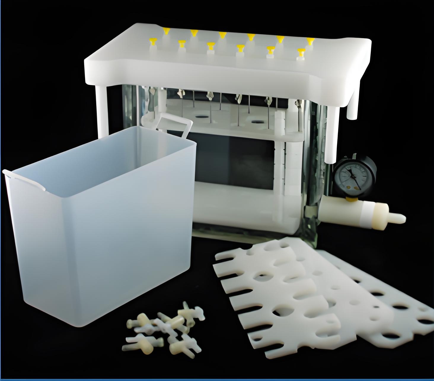 Mediwax固相萃取裝置可實(shí)現(xiàn)連續(xù)的樣品萃取和過濾,簡(jiǎn)化復(fù)雜的樣品預(yù)處理過程并節(jié)約時(shí)間。整套裝置含有一個(gè)透明玻璃槽和頂蓋,可通過抽真空控制樣品流過SPE小柱實(shí)現(xiàn)萃取程序。通過調(diào)整玻璃槽里面的支架可容納不同規(guī)格的樣品收集管,包括玻璃或塑料試管、自動(dòng)樣品瓶、容量瓶以及錐形瓶等,洗脫液通過選擇聚丙烯(PP)或不銹鋼導(dǎo)向針以及防交叉污染的特氟?。?/span>Teflon)連接管直接引入樣品收集管。12位裝置附贈(zèng)一個(gè)聚丙烯(PP)廢液槽,用于操作中收集廢液,可簡(jiǎn)化樣品處理過程中廢液的處理以及保持玻璃槽內(nèi)潔凈的環(huán)境。